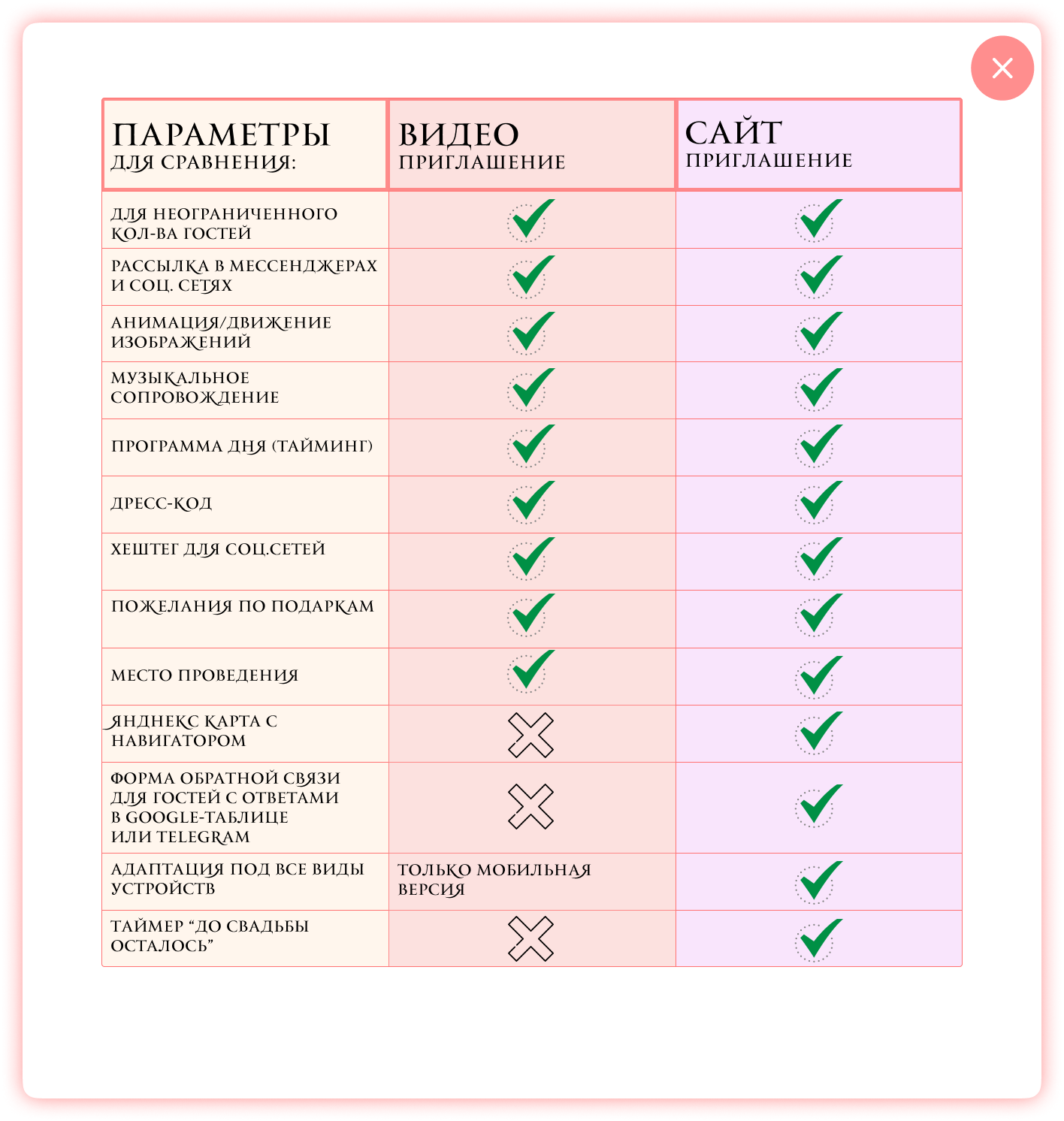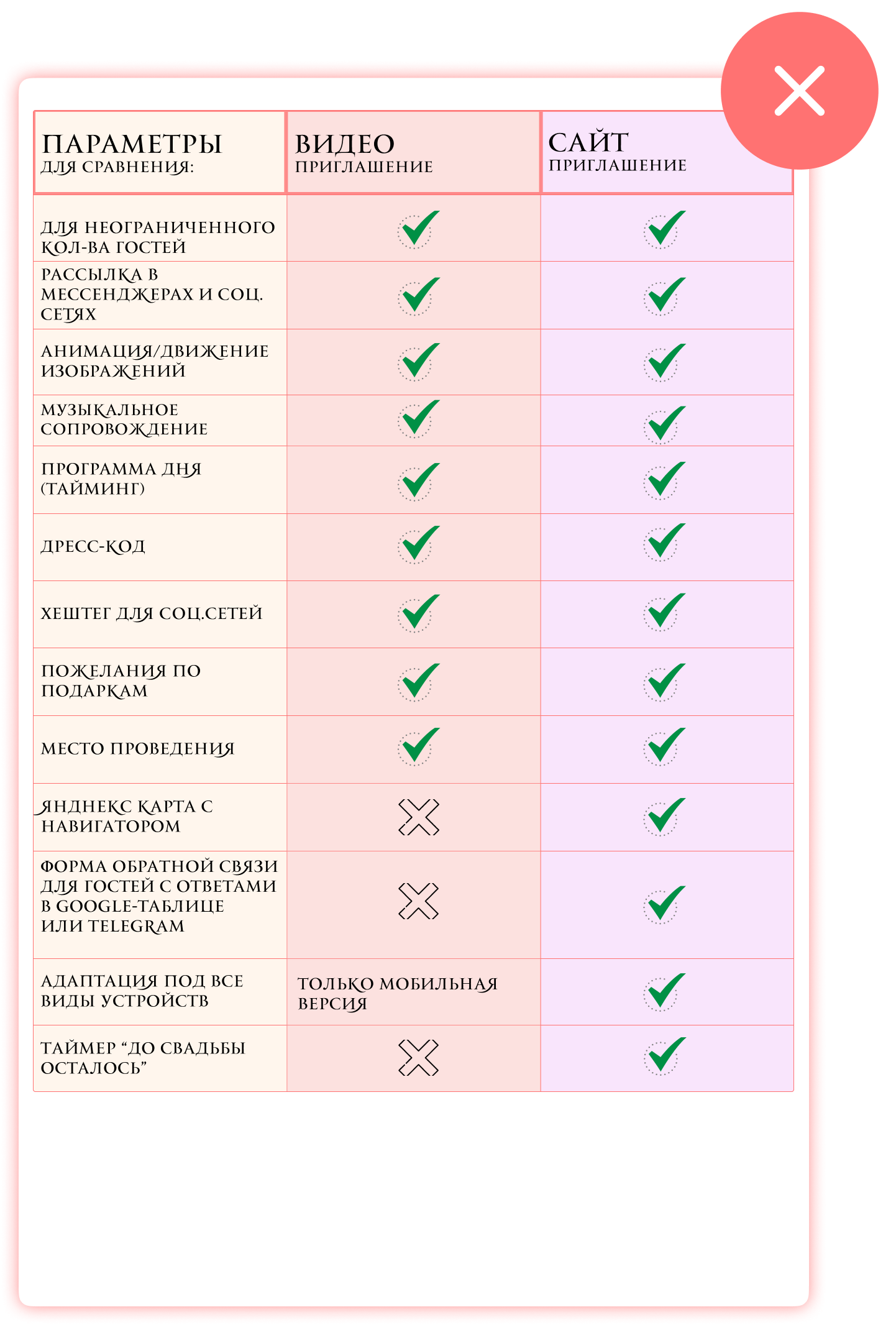 Музыкальное сопровождение; Блок для ПК с анимированным фоном; История любви; Программа дня; Пожелания по подаркам; Место проведения; Карта с местом мероприятия; Дресс-код с примерами; Анкета гостя; Контакты организатора.